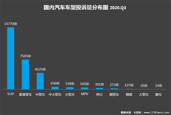 2020年三季度投诉大部分仍集中在SUV车型和紧凑型车中,其中SUV车型的投诉量较上季度出现明显增长,季度环比上涨45.1%。此外,本季度中大型车投诉同样出现激增,季度环比上涨30%,排名跃升至第四位,与部分德系和美系品牌热销车型投诉量异常增多有关。