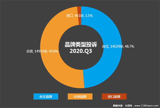 三季度,自主品牌的投诉量再次突破万宗,并创造了历史新高,投诉占比也提高了5.6个百分点,进一步拉近了与合资品牌投诉占比间的差距。相比之下,合资品牌投诉量虽然环比有所增长,但投诉占比已降至50%以下。