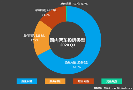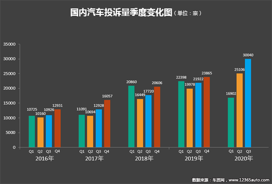 据国内领先的缺陷汽车产品信息收集平台车质网数据显示,2020年三季度共接到消费者对汽车产品的有效投诉30,040宗,同环比实现两位数增长,其中环比上涨19.7%,同比上涨37%,再次刷新了季度投诉量的历史最高纪录。据统计,本季度投诉共涉及179个汽车品牌旗下的980个车系,环比减少4个品牌,增加了29个车系。