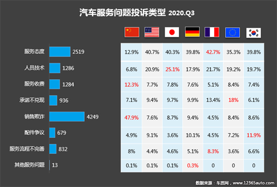 在2020年三季度服务类投诉问题中,销售欺诈问题投诉数持续高涨,较二季度暴涨约1.2倍,投诉增长点依旧集中在“与宣传不符”问题中,与部分自主品牌热销SUV车型投诉量持续增多有关。从各国别服务问题投诉占比横向对比中可以发现,法系品牌在服务态度问题上占比最高,日系品牌在人员技术问题上占比最高,而自主品牌则在销售欺诈问题上的占比要远远高于其他各国别品牌。