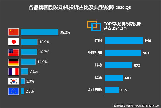 数据显示,在2020年三季度发动机故障投诉中,自主品牌仍然是投诉占比最高的国别品牌,较上季度提高了3.7个百分点。值得注意的是,德系和美系品牌发动机投诉占比较上季度有所提升,其中德系品牌提升了2.6个百分点。在发动机故障投诉排名中,“无法启动”问题首次进入TOP5排行,投诉增量来自于部分日系品牌车型。此外,“发动机故障灯亮” 问题投诉量进一步提升,较二季度上涨19.3%,投诉增长依旧来自于某法系品牌轿车。