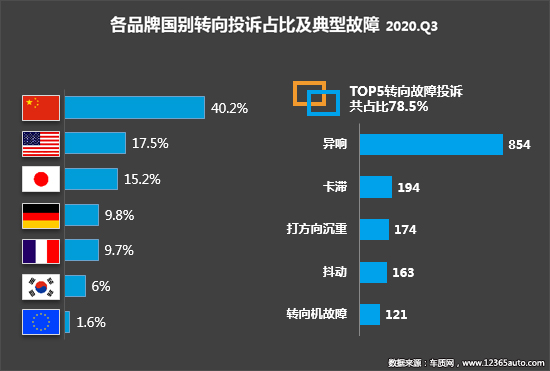 数据显示,本季度除自主和日系品牌外,其余各国别品牌转向系统投诉占比均有所提升,其中法系品牌提升幅度最大,较二季度提高1.7个百分点。在转向故障问题TOP5中,所涉及到的故障问题与二季度保持一致,“转向异响”问题依旧高居榜首,投诉量季度环比上涨16.5,投诉增量来自于部分美系、韩系和自主品牌车型。