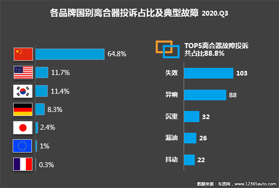 三季度,自主、韩系、德系和日系品牌离合器投诉占比均较上季度有所提升,韩系品牌提升幅度最大,季度环比提高了4.4个百分点。从投诉故障问题来看,“离合器失效”问题投诉再次突破百宗,排名跃升至第一位。“离合器沉重”问题时隔一年再次进入TOP5故障排行,投诉多来自某韩系品牌车型。