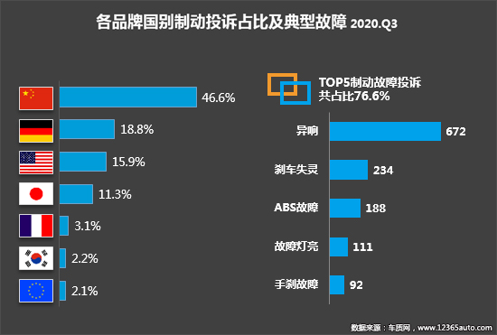 2020年三季度,德系品牌制动系统投诉占比提升明显,较二季度提高了2个百分点。值得注意的是,在TOP5故障问题中,“刹车失灵”问题投诉量延续了二季度的增长势头,季度环比大涨85.7%,投诉增长多来自于某美系品牌轿车。