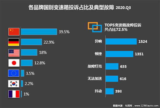 在三季度变速箱投诉中,“变速箱异响”和“变速箱顿挫”两类问题依旧排名最高,且投诉量较上季度均有所增长。时隔两年,“变速箱抖动”问题再次出现在TOP5故障中,投诉来自部分美系和自主品牌车型。从国别品牌来看,德系品牌变速箱问题占比出现明显提升,较二季度提高7.9个百分点,排名跃升至第二位,与一汽-大众旗下多款主销车型投诉量持续增多有关。