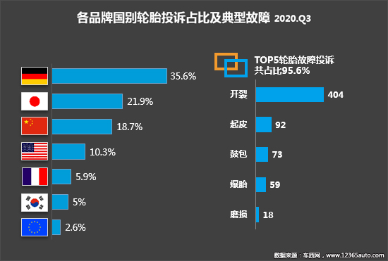 2020年三季度,德系品牌投诉占比依旧稳居第一位,但投诉占比有所降低,投诉仍多集中在部分德系和日系品牌车型,投诉故障问题集中表现为“轮胎开裂”。