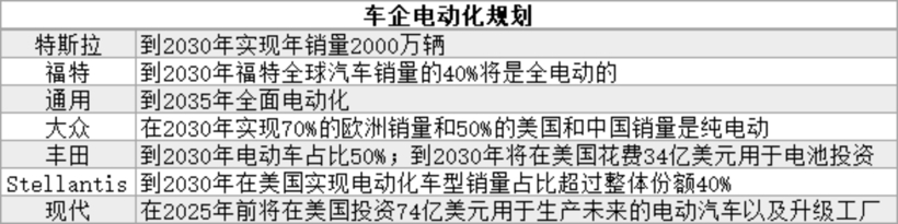 根据规划,特斯拉到2030年实现年销量2000万辆;通用计划到2035年实现全面电动化;到2030年,福特计划电动车渗透率40%;大众计划在美国实现50%的纯电动销量,Stellantis在美国电动化车型销量占比超过40%。