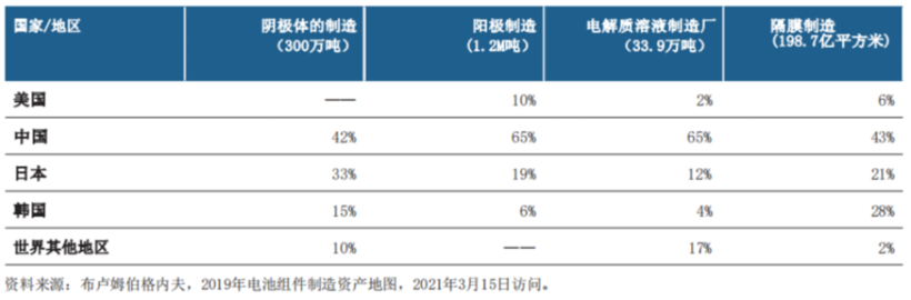 与产能需求不匹配的是,《美国锂电蓝图2021-2030》显示,在动力电池四大核心材料制造方面,美国处于明显劣势。而中国拥有领先优势,正极材料制造占比42%,负极材料65%,电解液65%,隔膜43%。