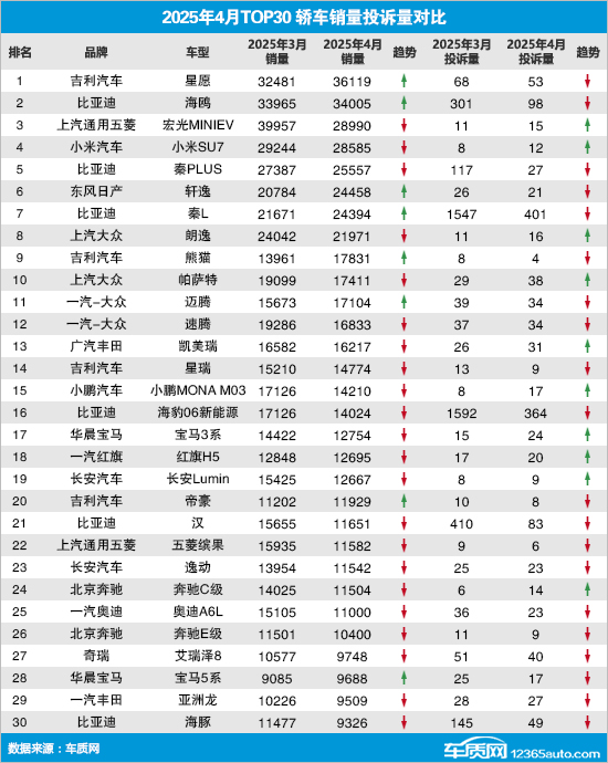 据乘联会提供的全国汽车产销数据显示,2025年4月份国内轿车市场累计零售销量82.1万辆,环比下降9%,同比上涨15.8%。同期,车质网受理车主针对轿车的有效投诉8,145宗,环比下降35.5%,同比上涨3.3%。去除投诉人自愿申请撤诉的信息后,2025年4月TOP30轿车销量投诉量排名如下: