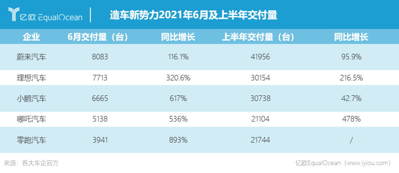 从2021年6月交付量来看,蔚来汽车稳居第一,理想汽车紧随其后,小鹏汽车、哪吒汽车和零跑汽车虽交付量不如前两者,但同比增幅较大,未来增长空间值得被看好。从2021年上半年交付量来看,蔚来汽车依然排名在首位,理想汽车和小鹏汽车交付量距离不大,但理想汽车同比增幅更具优势。哪吒汽车和零跑汽车上半年交付量不如前三者,但同比增长幅度最大。