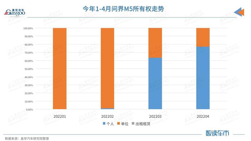 从1-4月累计终端销量来看,由于前两月单位用户较多,使得问界M5累计单位用户占比达到38.61%,而个人用户占比为61.37%,出租租赁用户占比0.01%,1-4月终端销量中,出租租赁用户仅有一个。