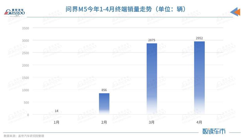 众所周知,问界M5是华为与赛力斯联合打造的AITO旗下的首款车型,已于去年12月底开启预售。今年3月5日起启动了全国交付,而4月是问界M5第一个完整交付月份。终端销量数据显示,问界M5在3月、4月连续两个月的终端销量都将近3000辆。
