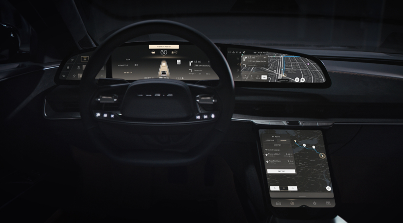 Glass Cockpit显示屏采用新屏幕布局,移动了最常用的应用程序(如家庭、导航、媒体和电话)的控件,使Lucid UX比以往更符合人体工程学。