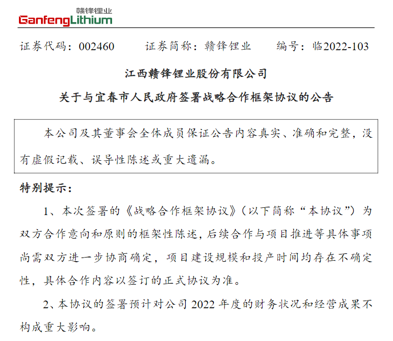 盖世点评:在国轩高科、宁德时代、比亚迪之后,锂矿巨头赣锋锂业也开始在宜春“锁矿”了。