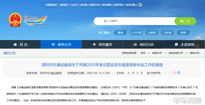 深圳市交通运输局关于开展2025年老旧营运货车报废更新补贴工作的通告